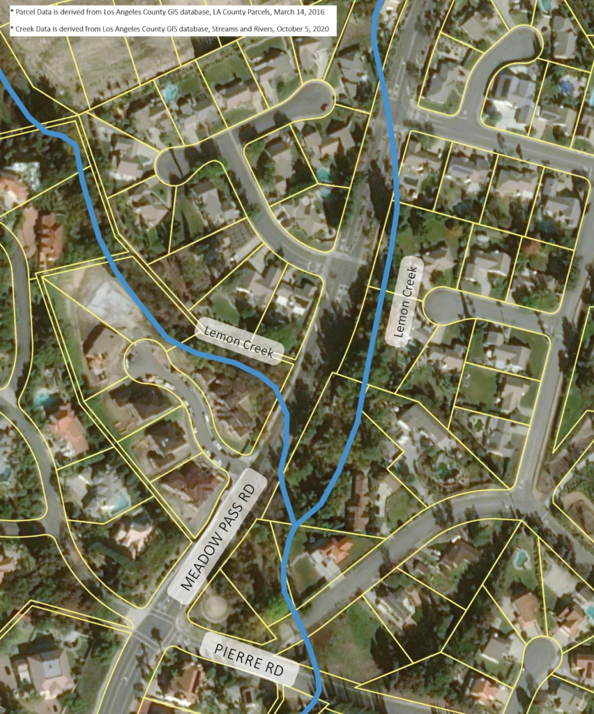 While it may not be apparent, much of the open space you see in Walnut is actually on privately owned lots. Throughout the City, there are hundreds of privately owned lots that contain creeks, public trails, and/or protected open space within their property lines. At least 30 of those lots contain sections of either Lemon Creek or Snow Creek. The accompanying illustration provides one example (out of many). It shows an area along Meadow Pass Road and indicates the course of Lemon Creek with blue lines and private property lines with yellow lines. As you can see, it shows more than a dozen privately owned lots that contain sections of Lemon Creek.